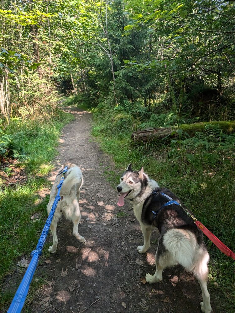 Mit Bauchgurt und Ruckdämpferleine habt ihr die Hände frei und seid direkt mit dem Husky verbunden. Je nach Kondition und Körperbau wird der passende Hund für euch ausgewählt. Bei besonders kräftigen Vierbeinern können auch „3er-Teams“ gebildet werden – zwei Wanderer teilen sich dann die Führung eines Huskys.